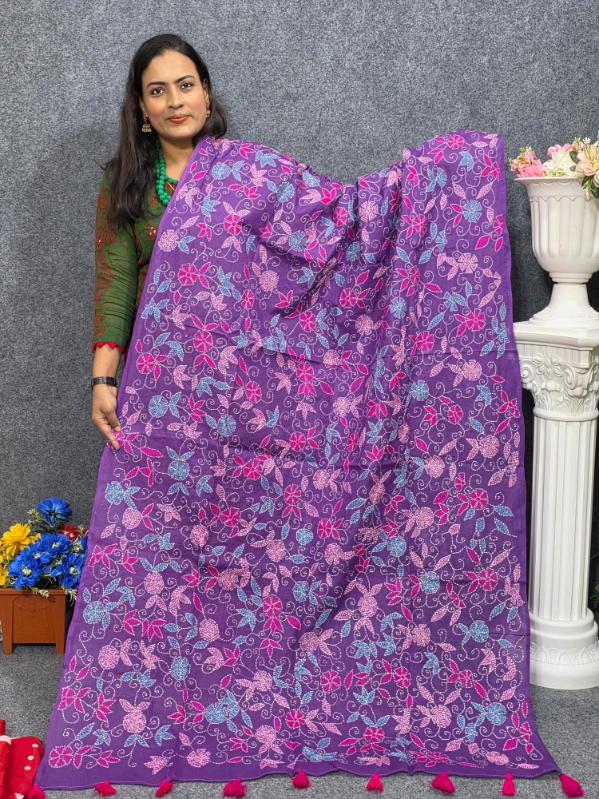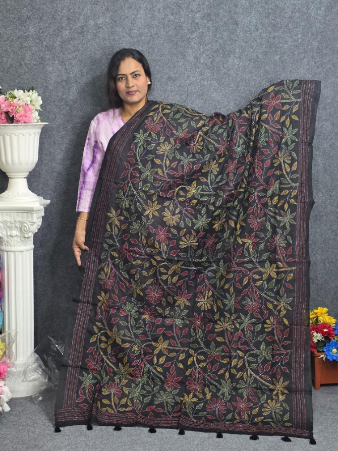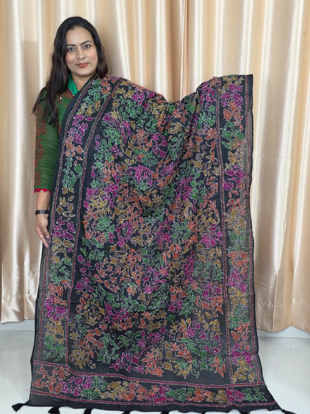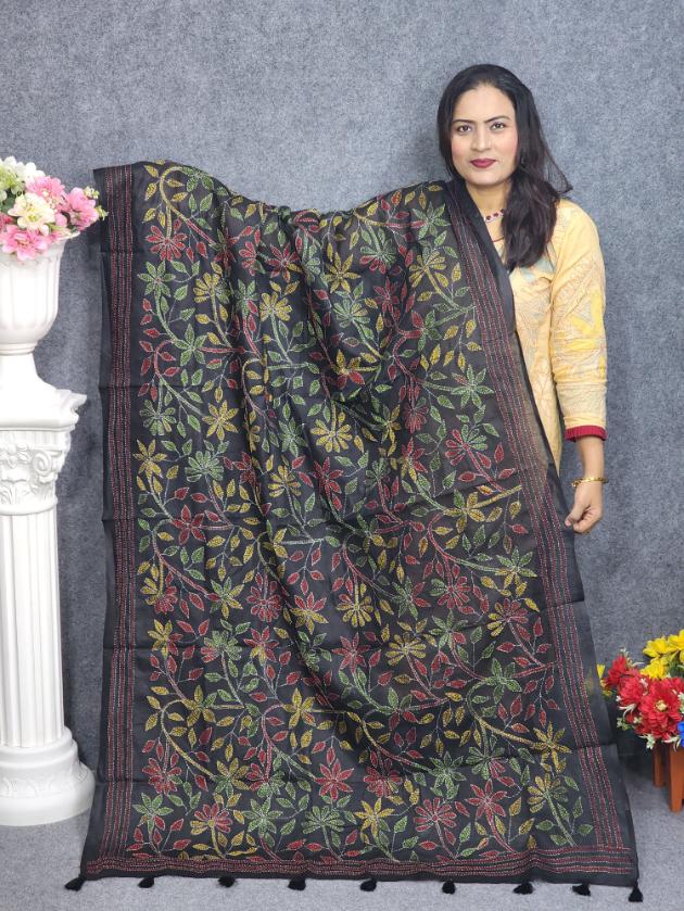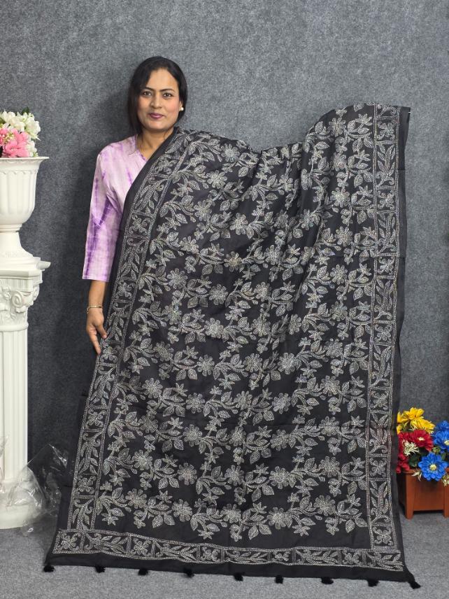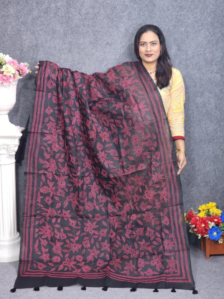 Black Hand Embroidery Dupatta On Cotton