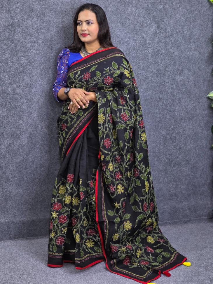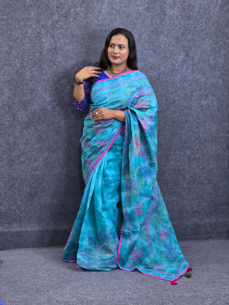 Kantha Work Suti Saree Voil-Olive Color