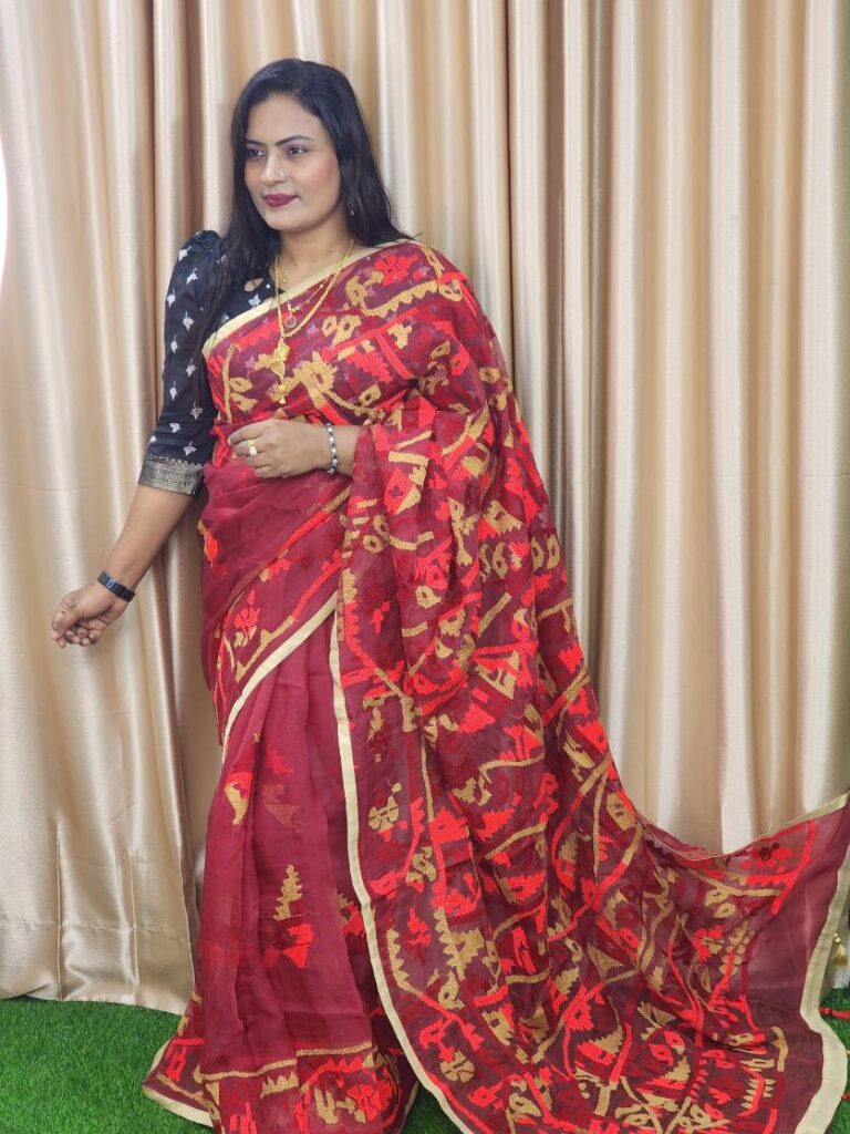 Red Rajshahi Pure Moslin Saree With Hand Embrodery-Elegance BD