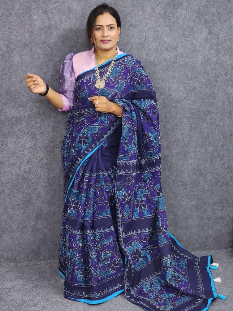 হাতের কাজের সুতি ডিপ নীল শাড়ী