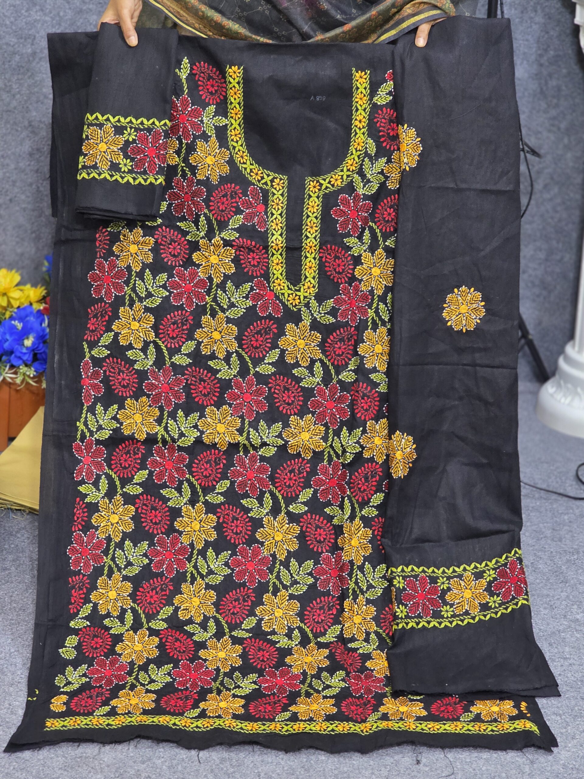 ওড়নার মাপ- 2 /৫ হাতের  , প্যান্টের কাপড় আড়াইগজ দেয়া আছে এবং কাজ করা আছে