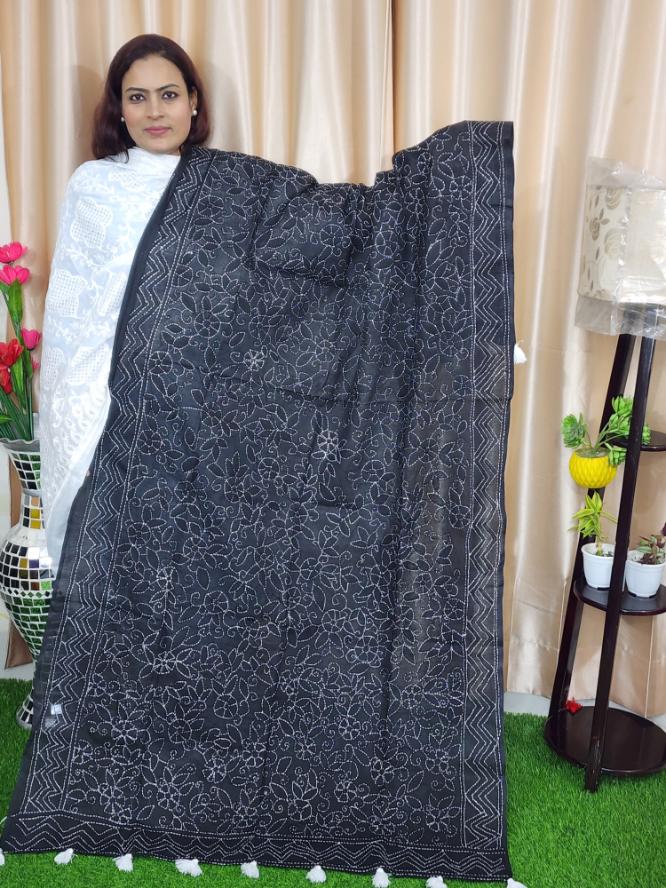 White Hand Stitched Dupatta On Black Fabric