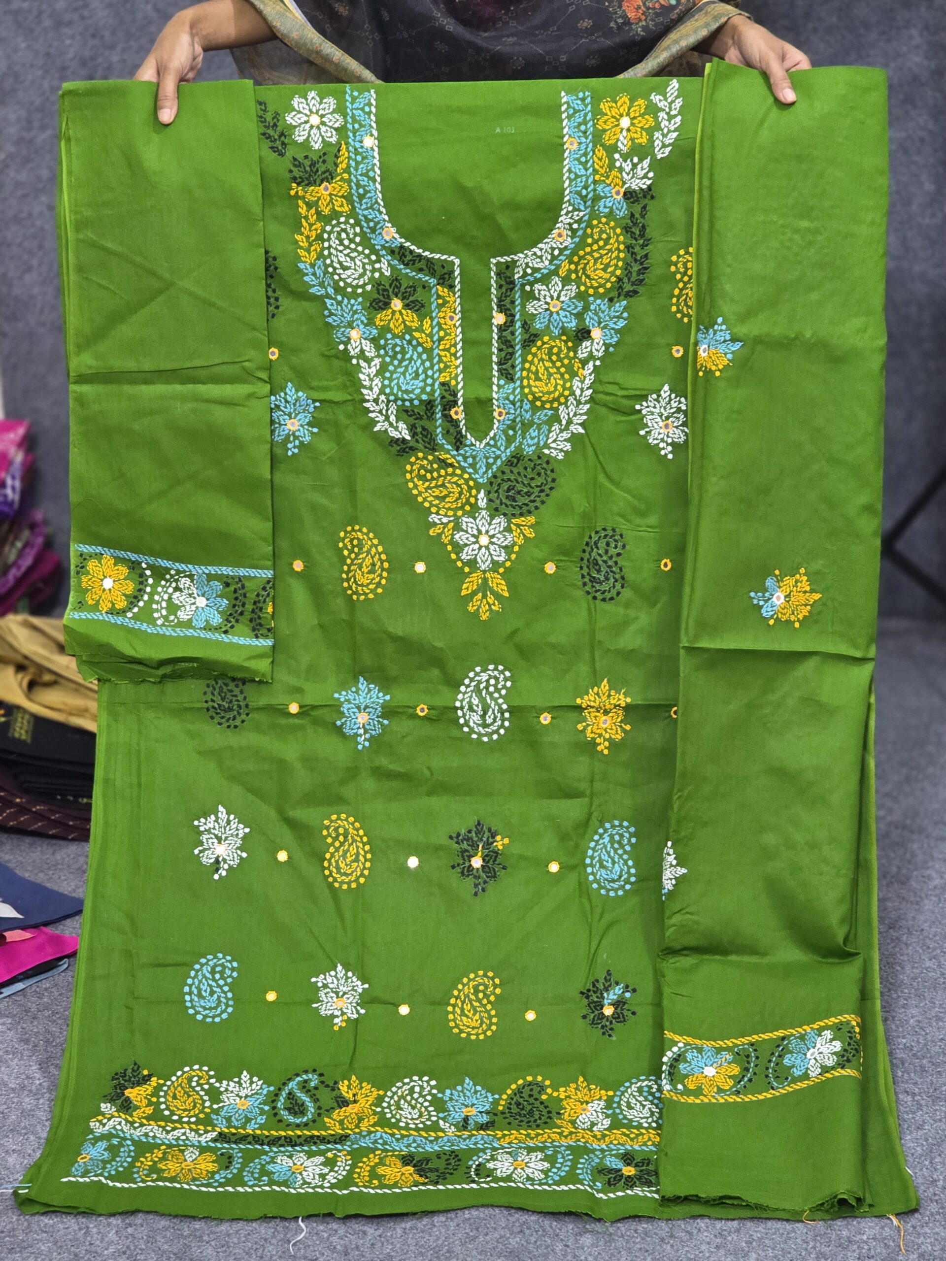 ওড়নার মাপ- 2 /৫ হাতের  , প্যান্টের কাপড় আড়াইগজ দেয়া আছে এবং কাজ করা আছে