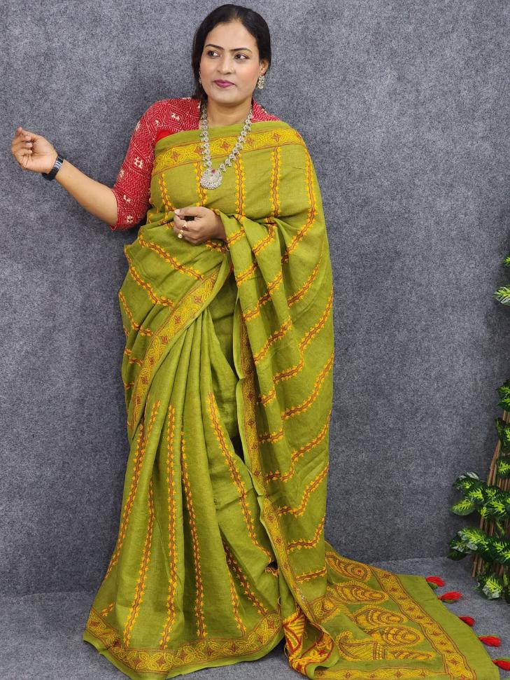 Kantha Work Suti Saree Voil-Olive Color