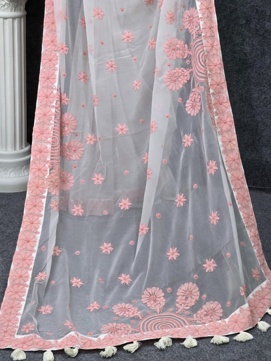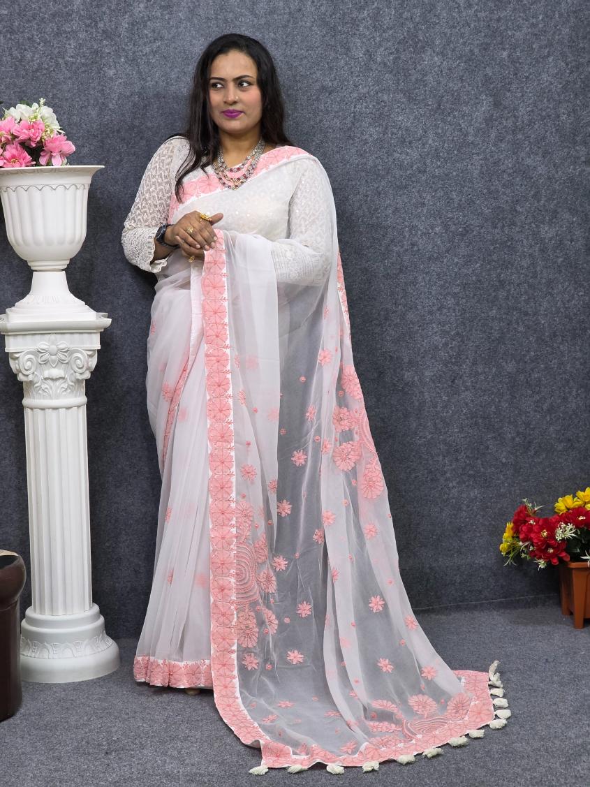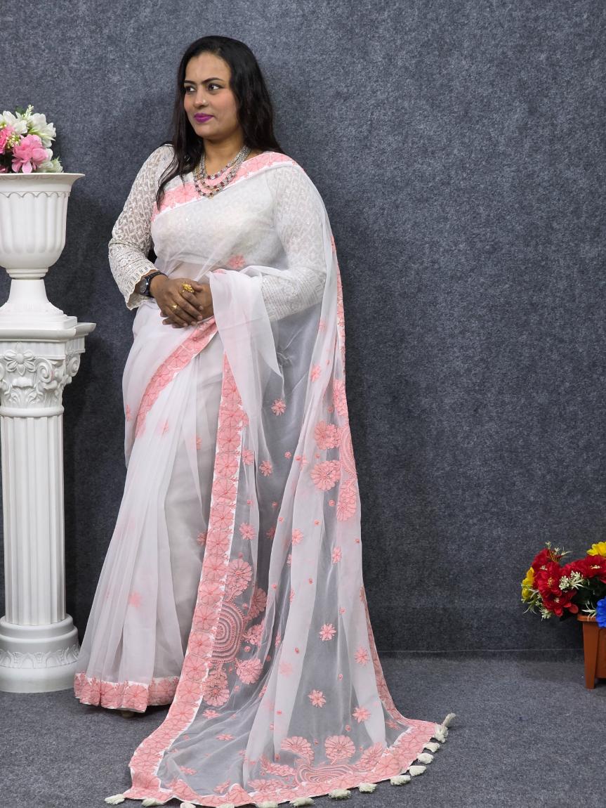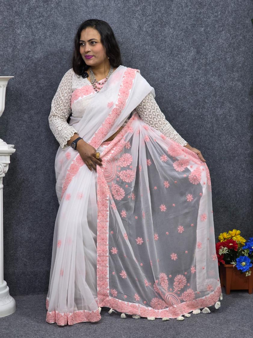শাড়ি – White Georgette Lucknow Saree